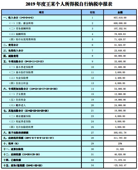 综上所述,通过以上9个步骤的计算,王某2019年应纳税所得额计算结果出来了,全年应纳税所得额为311787.50元(616839.28-305051.78),适用25%税率,速算扣除数为31920元,应纳税额为46026.88元,减去已预缴税额71370.34元(23760+27352.94+8828.83+11428.57),还应退税25343.47元。其计算过程详见表。
